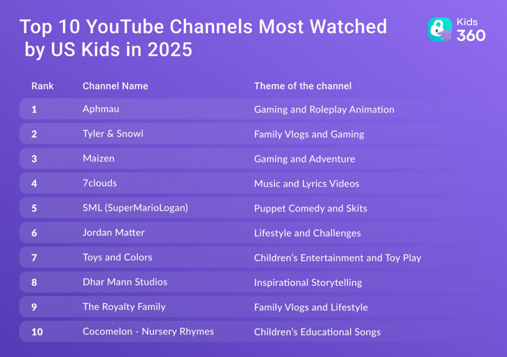 On Kids360 specifically, the data shows that kids spend their time watching some of YouTube’s most popular videos and channels. The most viewed video channel watched through Kids360 is from a channel called “Aphmau”, a Minecraft content channel with over 23 million subscribers. The second most-watched YouTube channel by kids whose parents use Kids360 is “Tyler & Snowi.” Their channel has over 1 billion views and the creators are known for their popular Roblox videos. You can see below which content creators kids are following most closely in the table below and how it compares to your own kids’ YouTube activity: