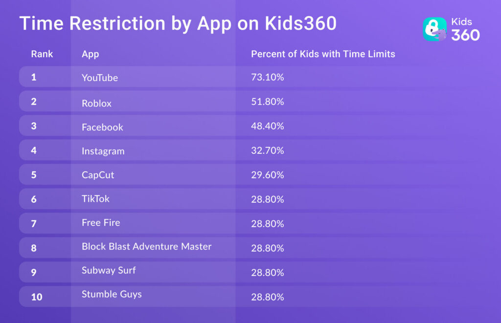 It’s really no surprise that YouTube is the most restricted app on the Kids360 platform, because it’s one of the most frequently used by kids worldwide. According to Statisa, kids in the US, ranging from ages 2-12, spent an average of 1 hour and 48 minutes per day watching videos on YouTube in 2024. Following close behind is TikTok with an average of 1 hour and 34 minutes spent on the app in the same day as time spent on YouTube. That’s over 3 hours per day of video streaming, which is a lot for little minds to process.