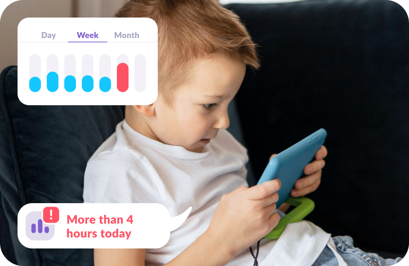Vedi il tempo schermo di tuo figlio in un pannello di facile lettura, con i dati dei vari periodi: giorno, settimana o mese