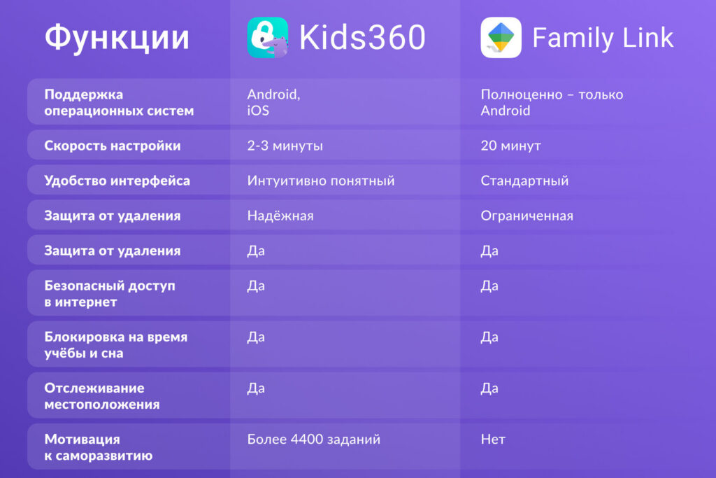 Сравнительная таблица возможностей Google Family Link и Kids360