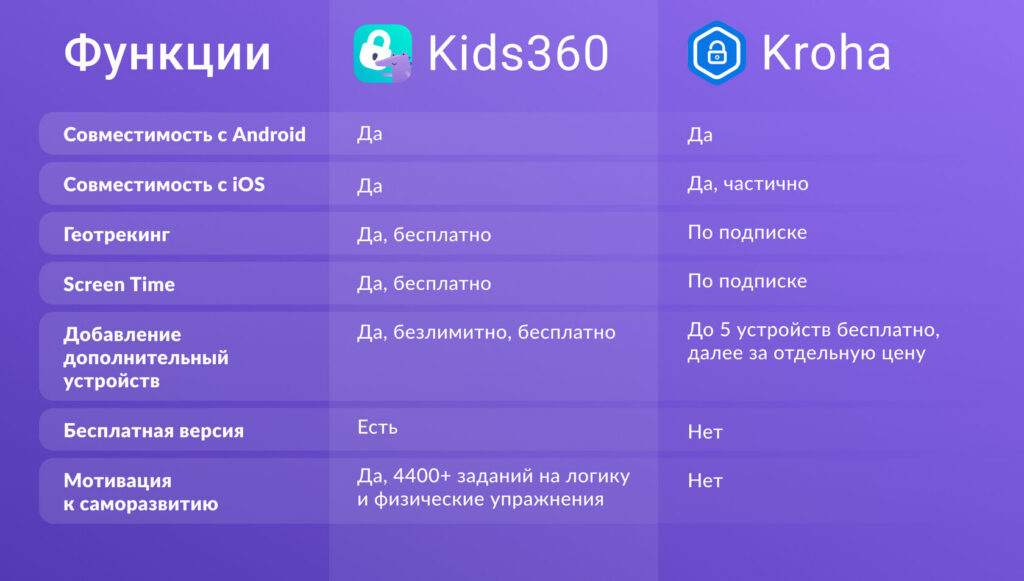 Сравнительная таблица возможностей приложения Kroha и Kids360
